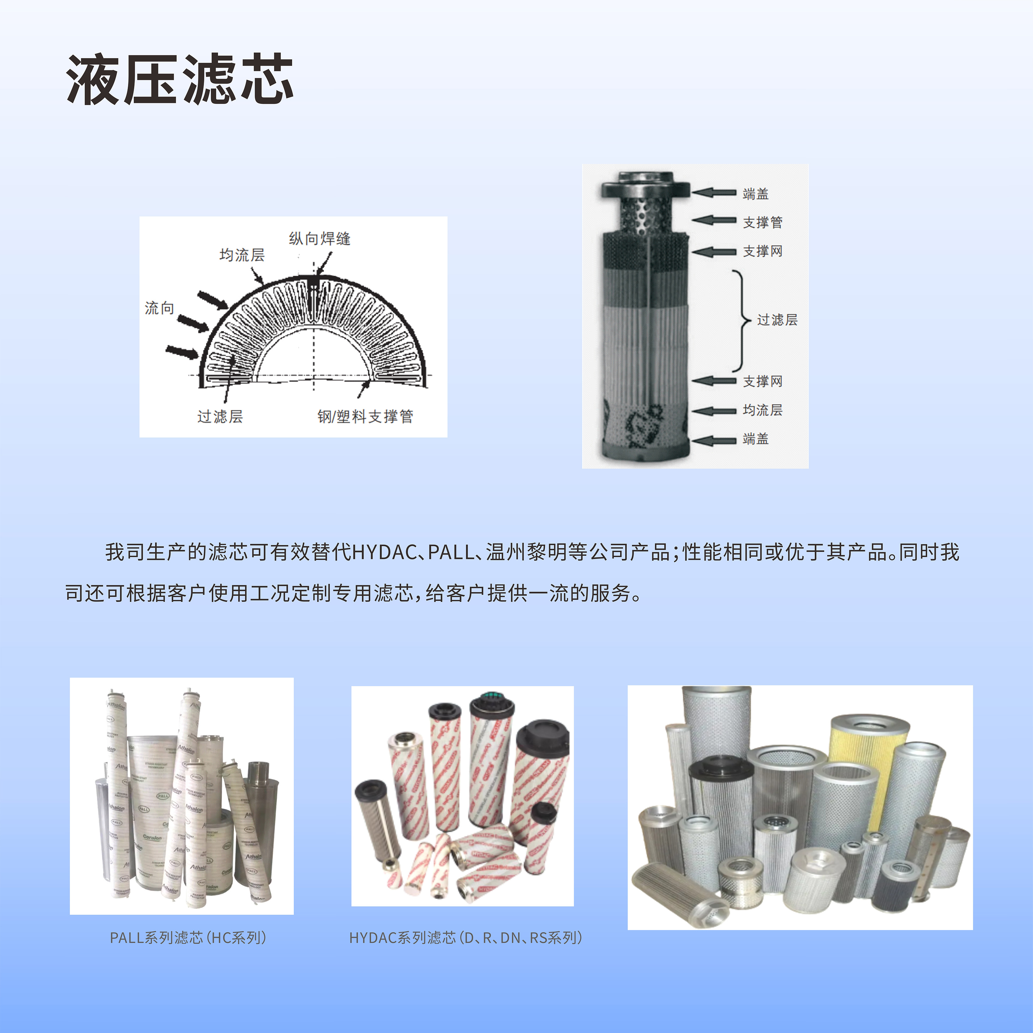 液壓濾芯由上、下端蓋,濾層(由過濾層、支撐層、均流層)以及骨架組成,濾層以圓柱體的形狀以圓柱體的形狀固定在內、外骨架之間,并在上、下端蓋處密封,應用時根據實際情況確定液體的流動方向(從濾芯外流向濾芯內部或從內部流向外部)。